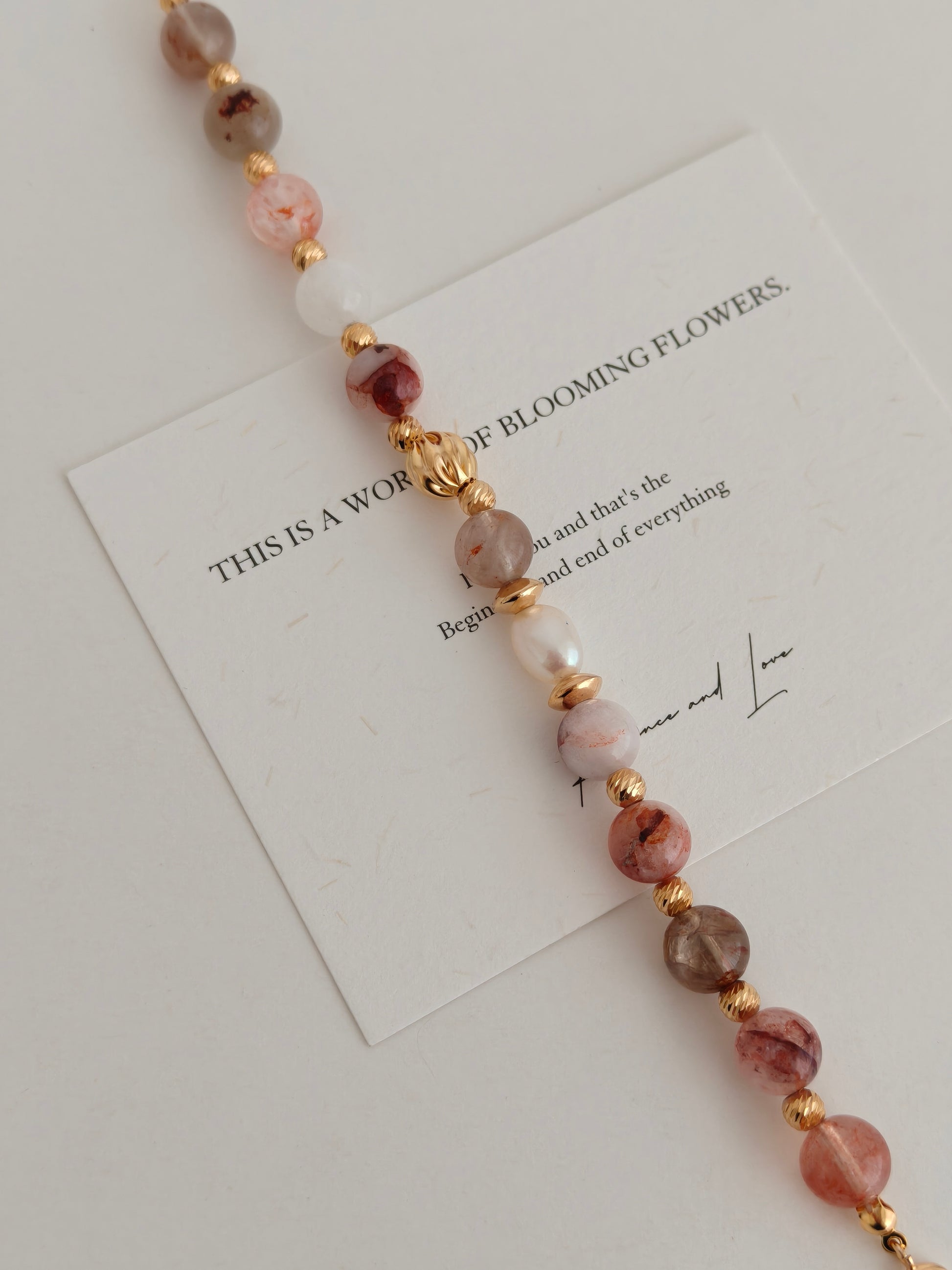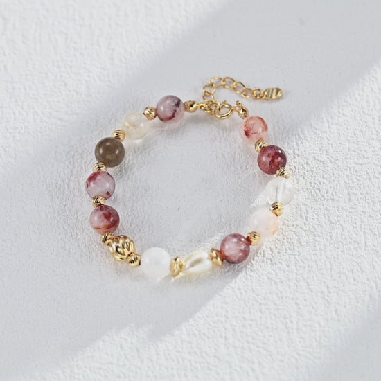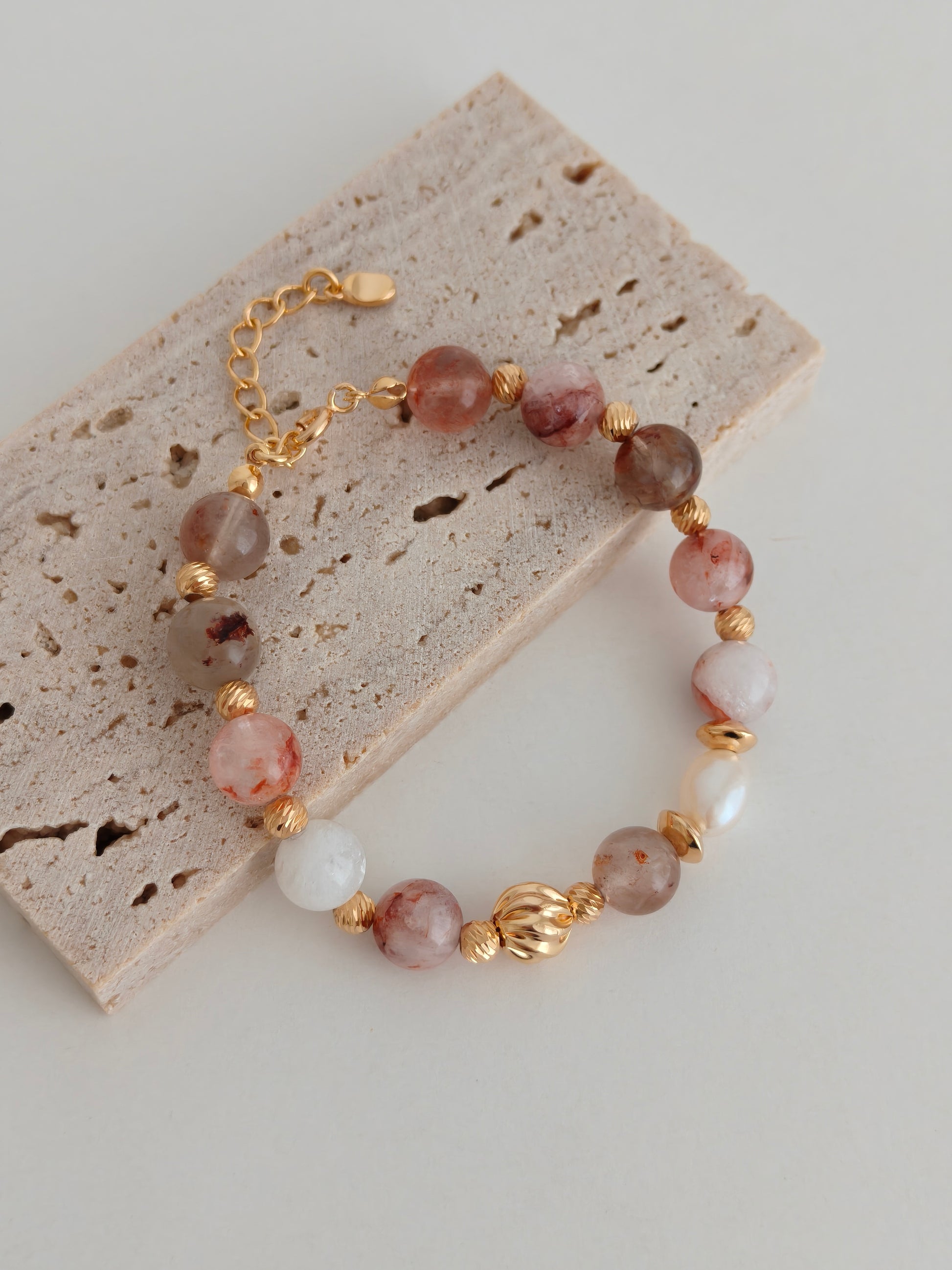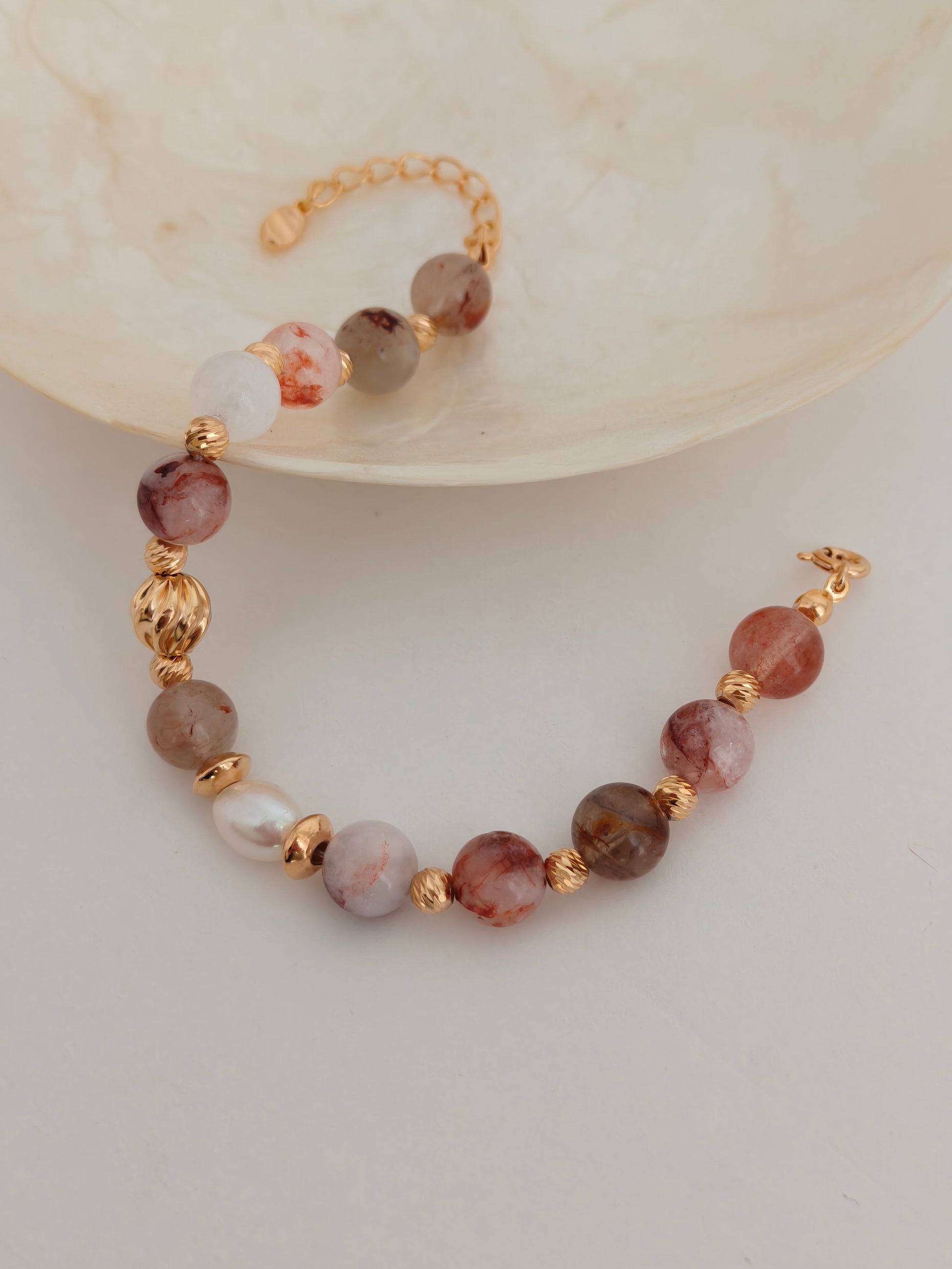 A vintage-inspired beaded bracelet featuring natural freshwater pearls paired with Red Hematoid Quartz (also known as Fire Quartz) — a distinctive natural gemstone admired for its warm red mineral inclusions and organic earthy character. Each stone displays unique internal patterns, giving every bracelet a one-of-a-kind artistic look.