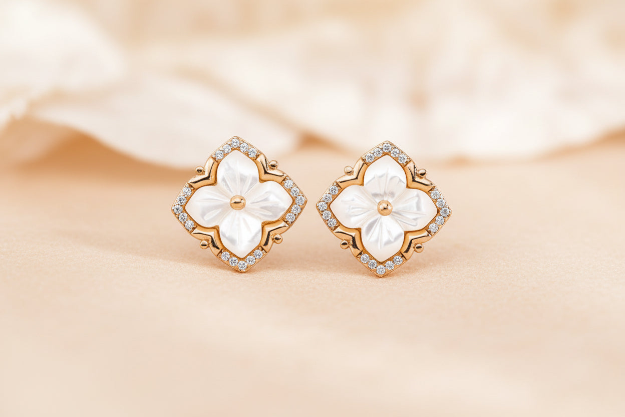 Delicate yet eye-catching, these vintage-inspired floral stud earrings feature luminous mother of pearl petals framed in a refined geometric silhouette. Sparkling cubic zirconia accents add just the right amount of brilliance, while the S925 sterling silver base ensures lasting quality and comfort.
