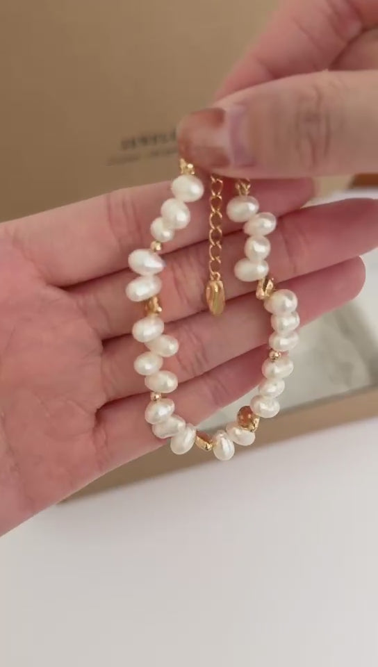 Crafted from 925 sterling silver with a warm vintage gold finish, this bracelet features natural freshwater pearls (approx. 4–5mm) arranged in a delicate, organic pattern. The soft irregular pearls bring effortless femininity, while gold accents add refined detail.