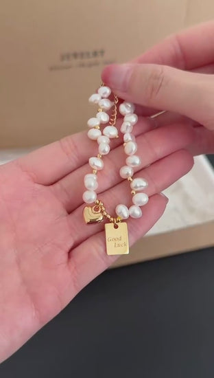 Crafted with natural freshwater pearls and sterling silver coated in luxurious gold plating, the Eternal Luck Pearl Bracelet radiates sophistication. Adorned with a heart charm and a “Good Luck” tag, this versatile piece symbolizes love and positivity, making it a thoughtful gift or a chic addition to your everyday jewelry collection.