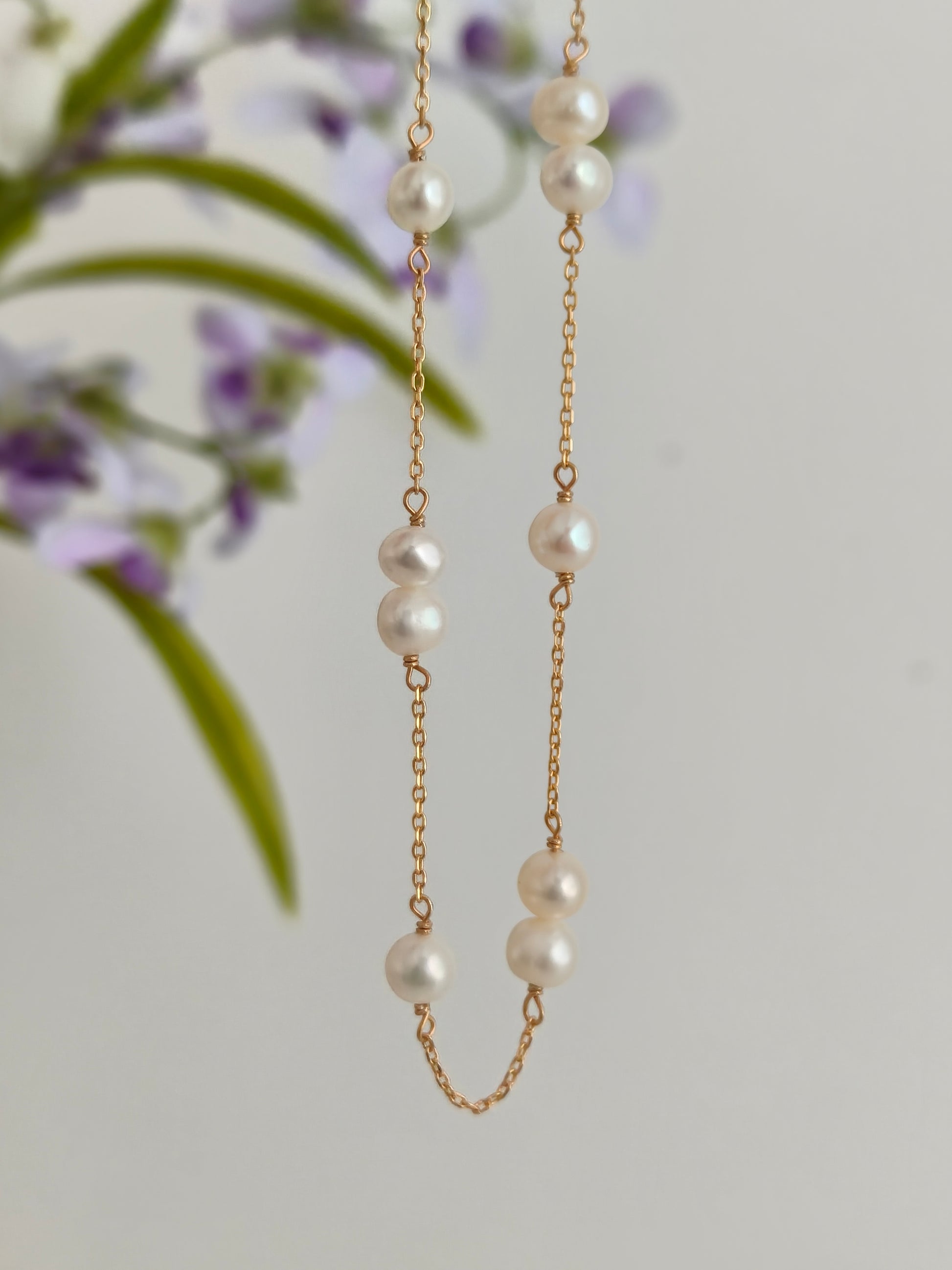 A delicate station-style necklace featuring evenly spaced natural pearls on a fine sterling silver chain. Lightweight, elegant, and perfect for layering or everyday wear.