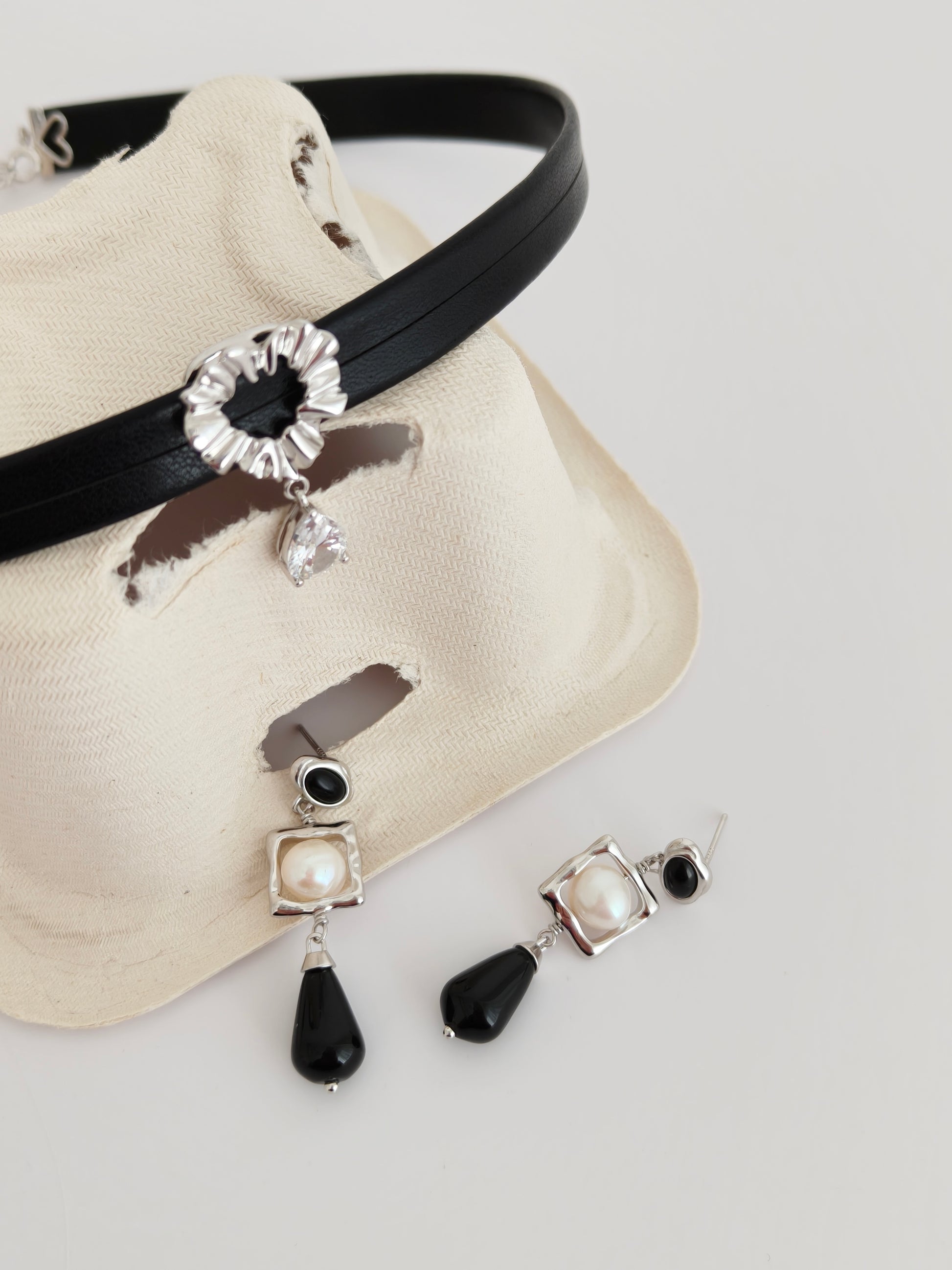 The earrings combine luminous natural pearls with smooth onyx teardrops, set in polished 925 sterling silver. The matching choker features a soft velvet band with a sparkling zircon pendant for an edgy yet refined style.