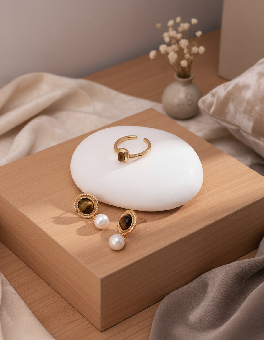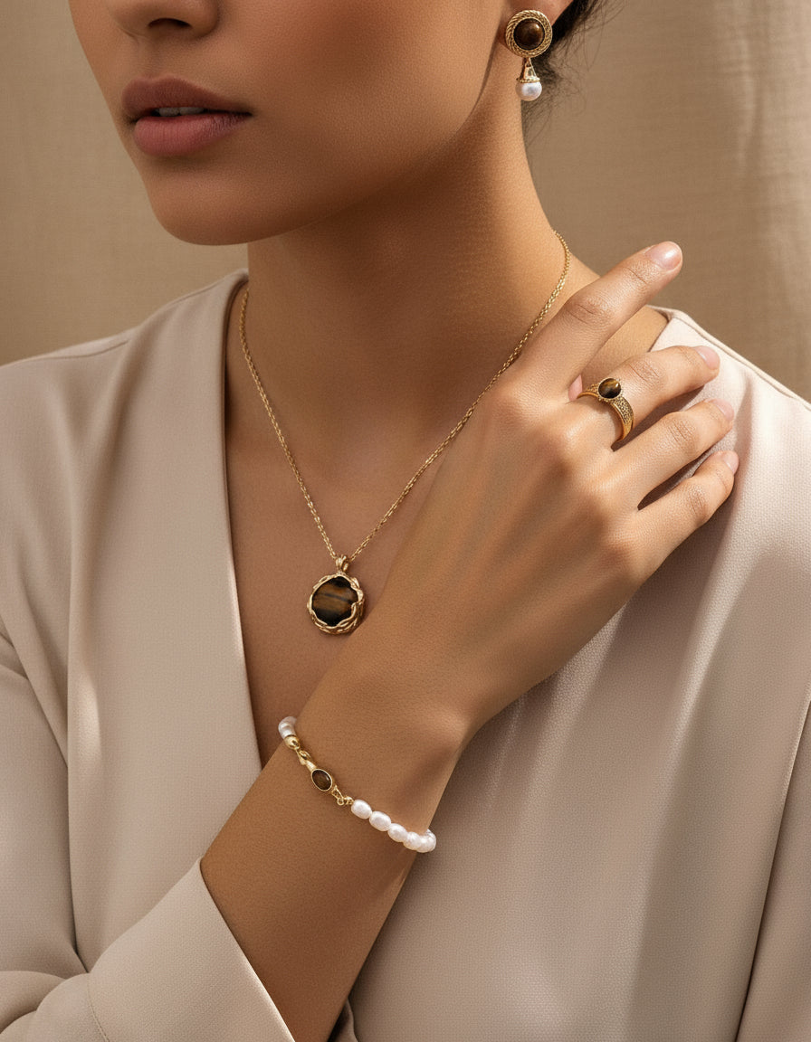 These elegant earrings feature a refined balance of natural pearls and tiger eye stones, creating a look that’s both classic and captivating. Each pearl exudes a soft, natural luster, while the tiger eye’s deep golden shimmer adds a hint of mystery and strength.