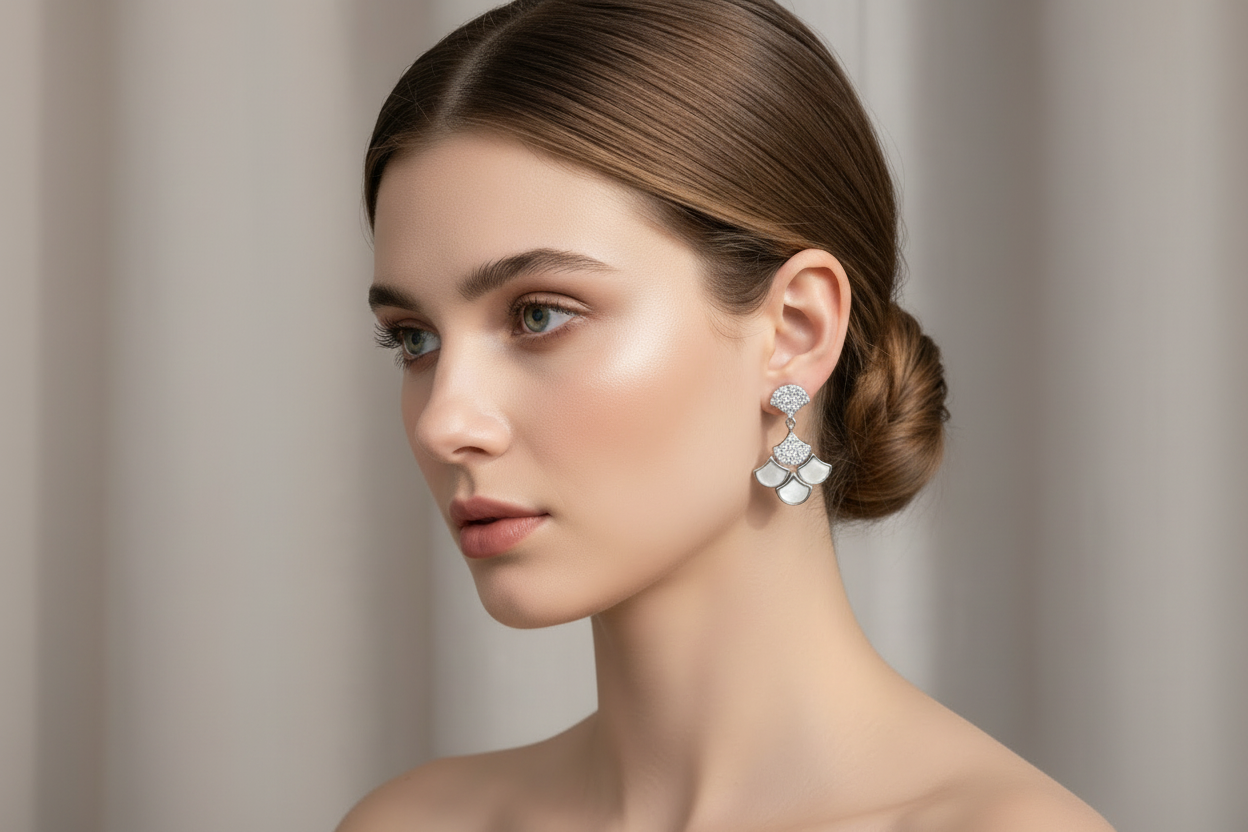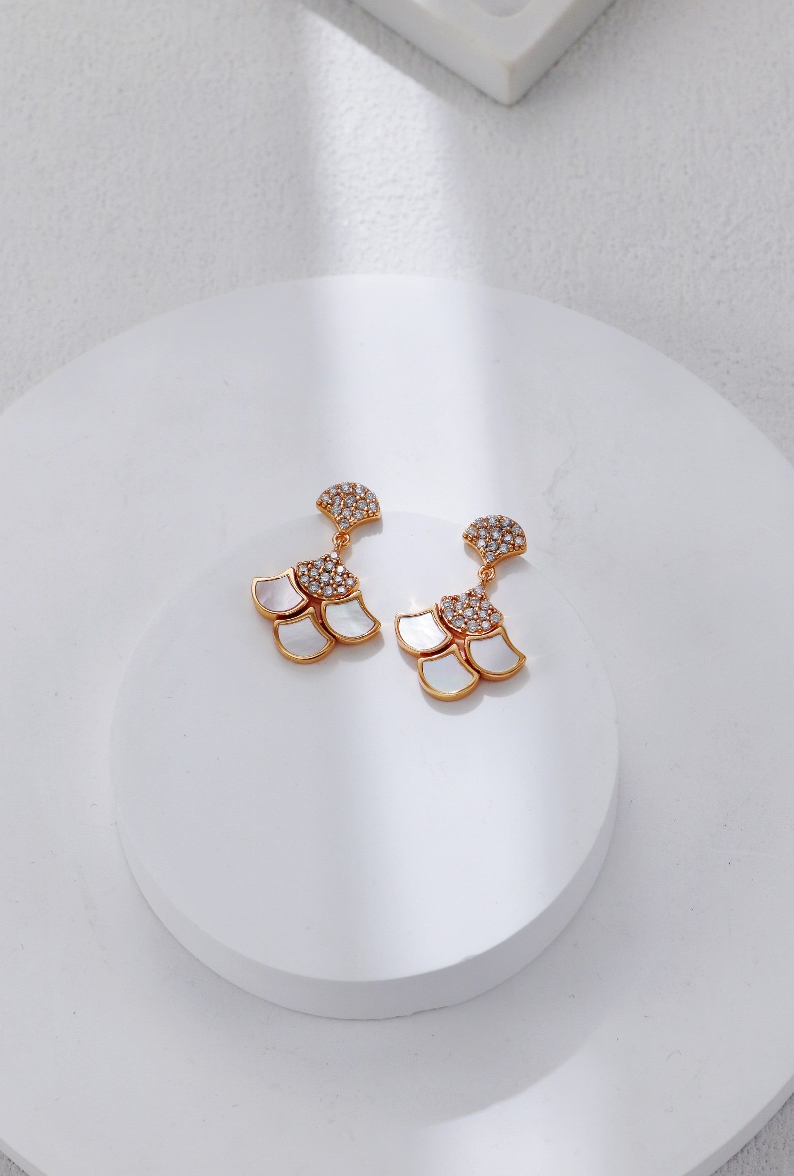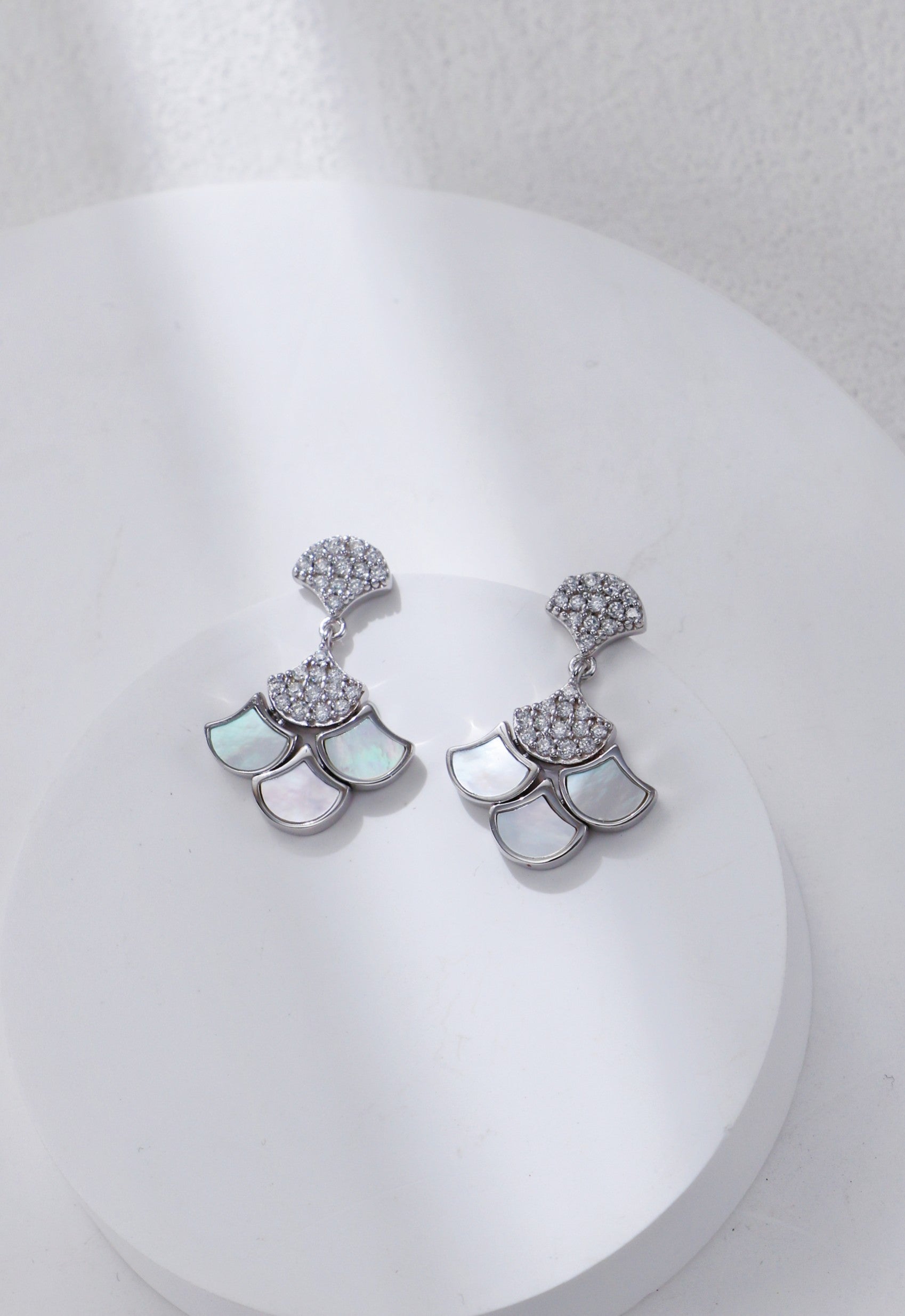 Elegant and luminous, these earrings are crafted from S925 sterling silver and feature a smooth white shell centerpiece accented with sparkling zircon stones. The combination of natural shell and delicate sparkle creates a look that’s both fresh and sophisticated, perfect for adding a touch of elegance to any outfit. Available in vintage gold and platinum finishes, these earrings are a timeless addition to your jewelry collection.