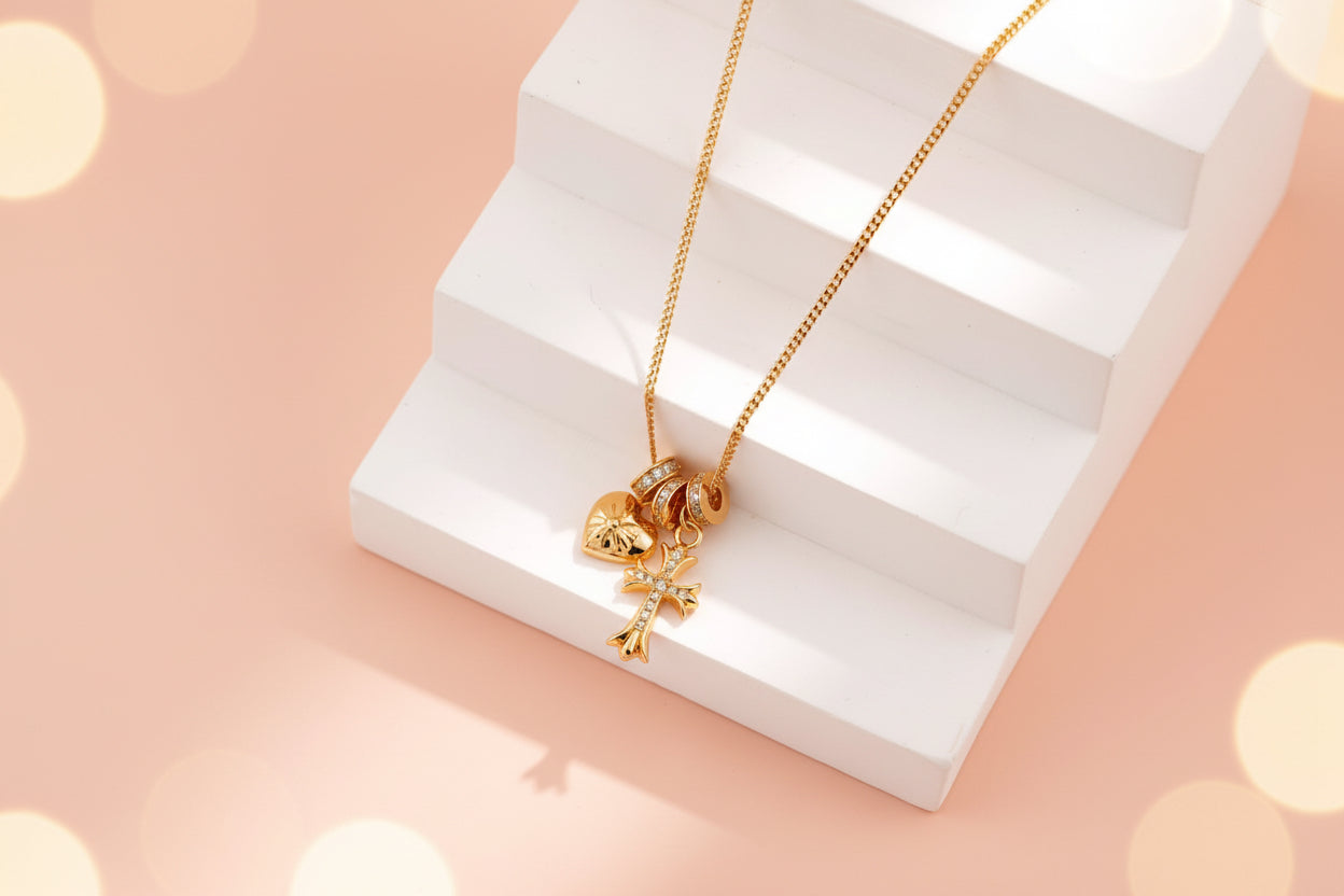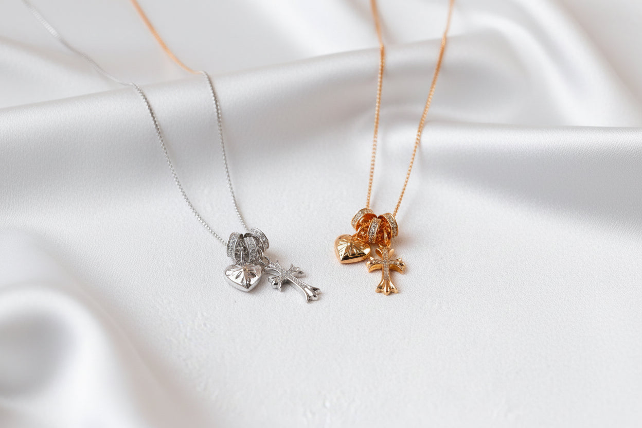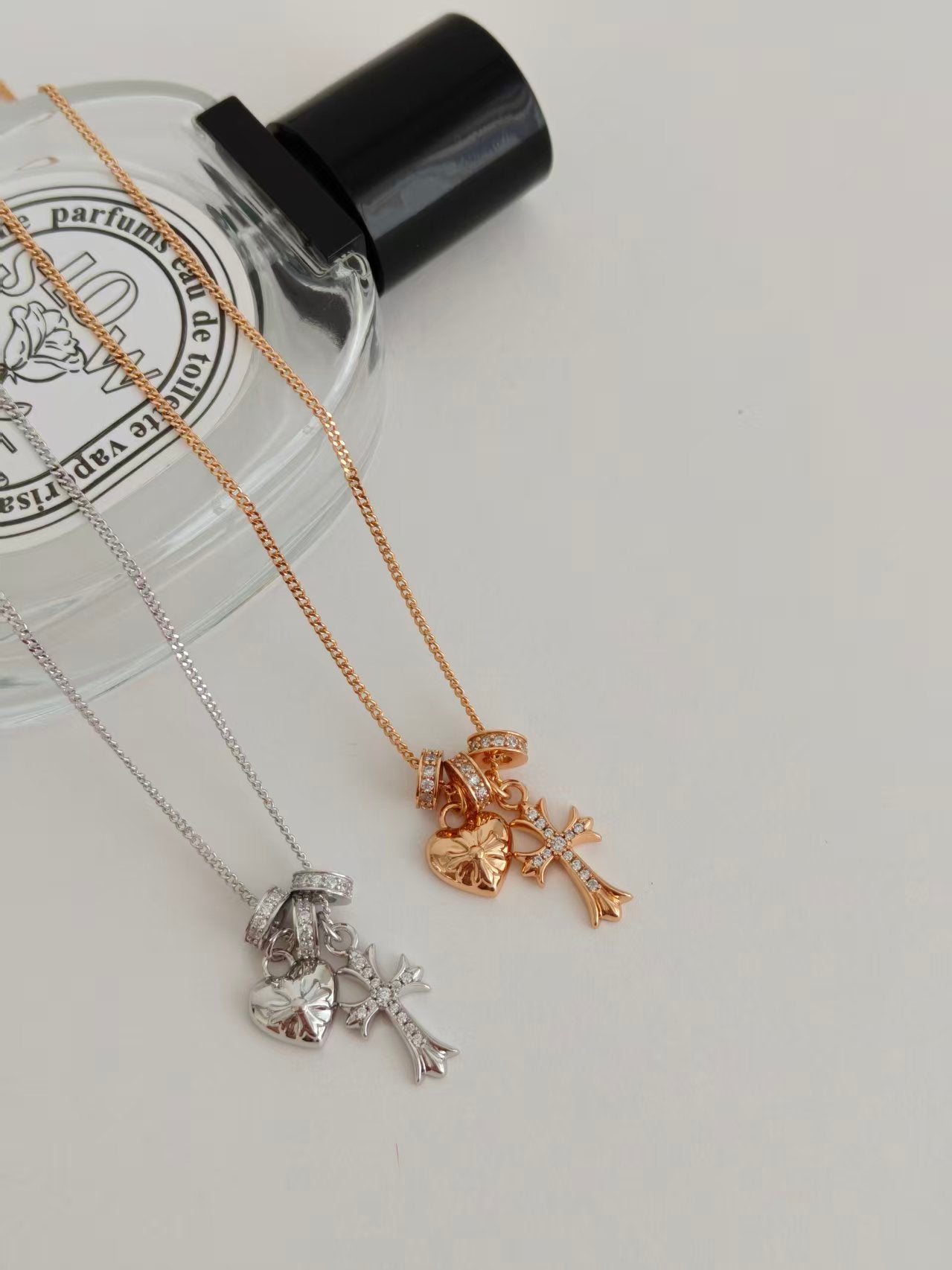 A meaningful charm necklace featuring a delicate cross and heart, crafted in S925 sterling silver and finished with sparkling cubic zirconia. A timeless piece symbolizing love and faith.