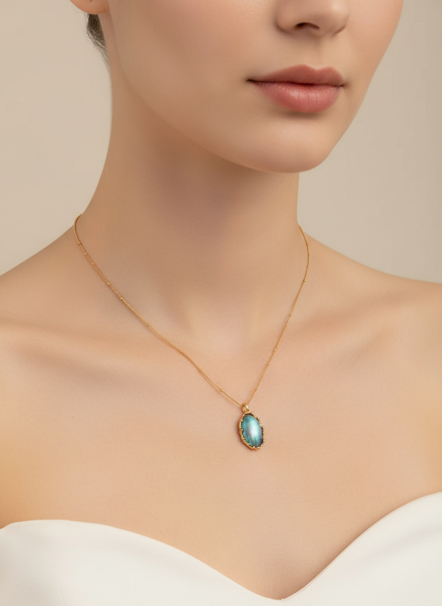 This elegant S925 silver necklace features a natural Mabe pearl—each one unique, glowing softly with an ethereal blue shimmer reminiscent of ocean light. Set in a finely crafted vintage gold bezel, the pendant brings together timeless sophistication and organic beauty. A perfect piece to elevate both everyday and formal looks.