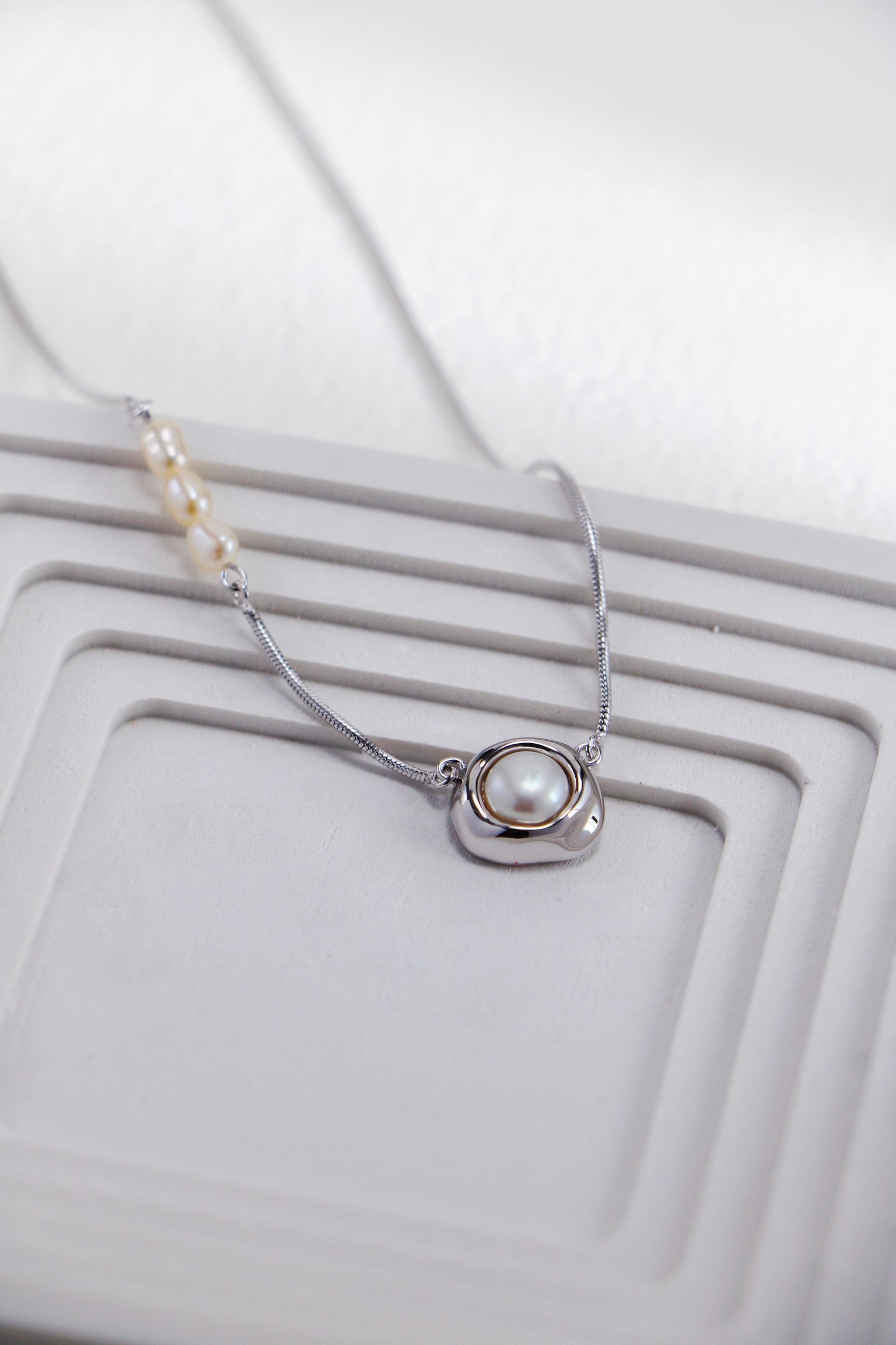 Elegant and timeless, this necklace is crafted from S925 sterling silver and adorned with a natural freshwater pearl. The delicate design highlights a luminous 5mm pearl set beneath a softly rounded pendant, adding a touch of sophistication to any look. Available in vintage gold and platinum finishes, it’s perfect for layering or wearing alone as a refined statement piece.