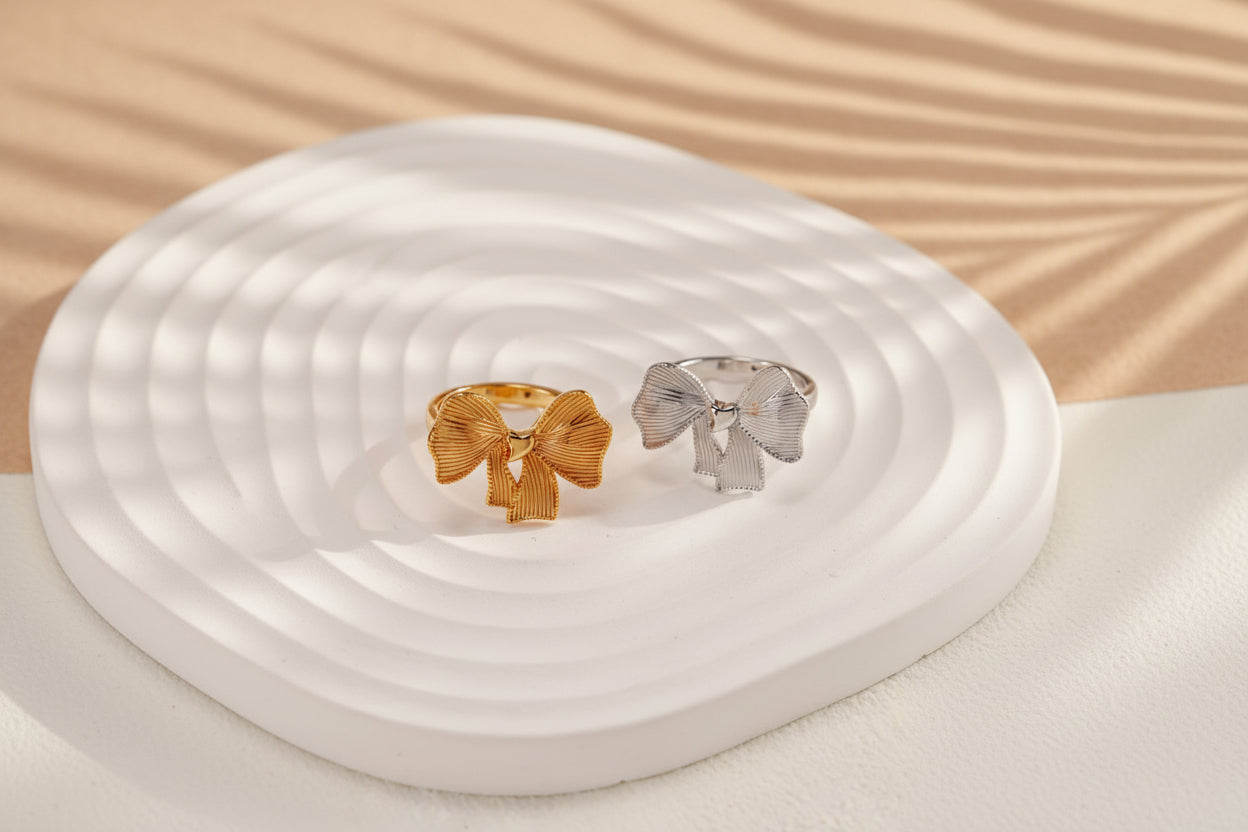 Inspired by classic ribbon bows, this sterling silver ring features finely engraved lines that catch the light with every movement. The dimensional bow design adds a romantic, vintage feel while remaining modern and wearable. Finished in your choice of warm vintage gold or cool platinum tone, it’s perfect worn solo or stacked for a statement look.
