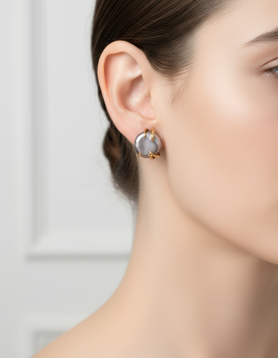 Elevate your everyday elegance with this stunning jewelry set, crafted with luminous natural pearls and vintage gold-toned S925 sterling silver. The set includes a delicately designed necklace and a pair of chic stud earrings – each featuring a unique gray baroque pearl securely held by artistic claw-style prongs.